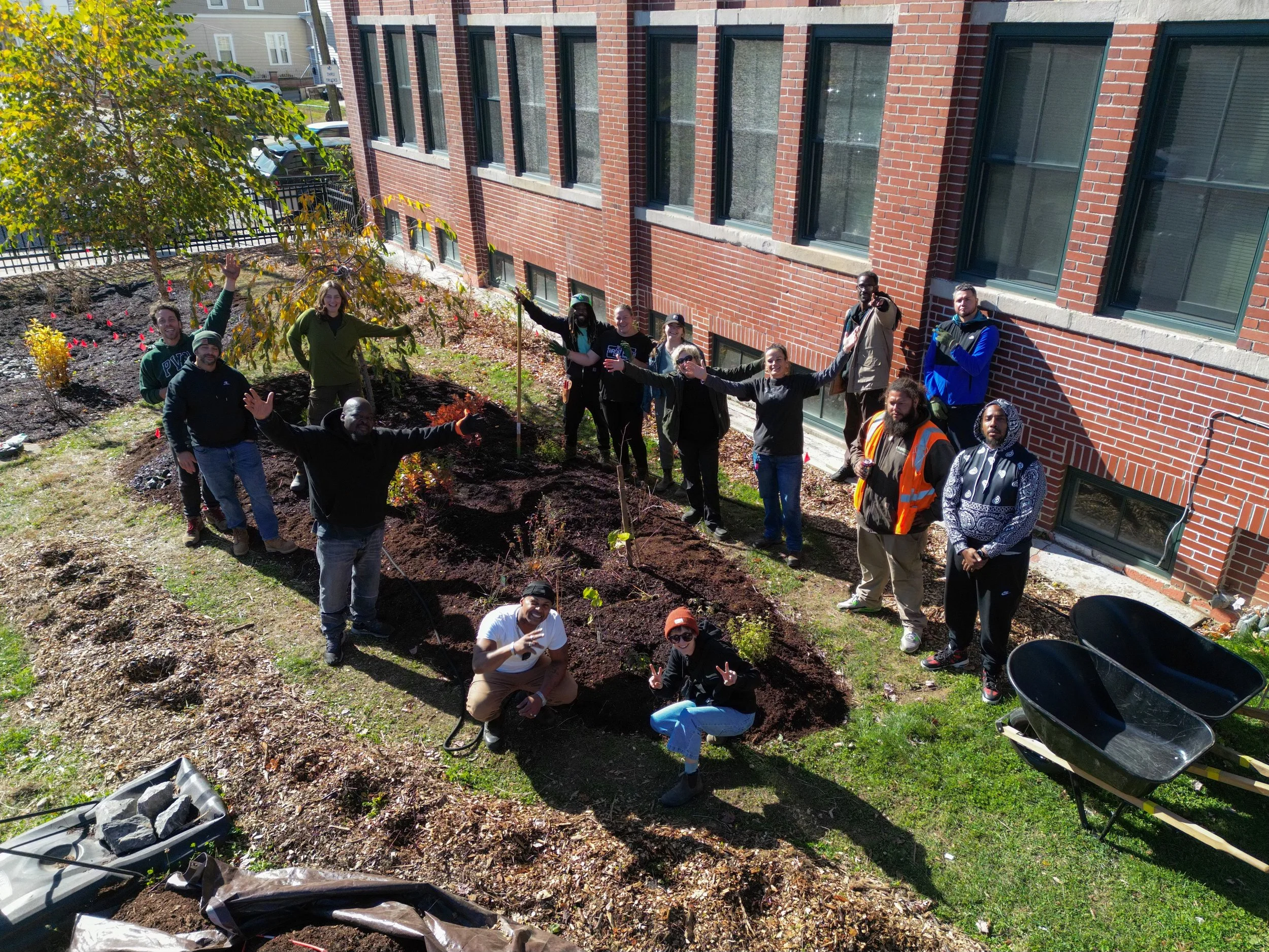 Each spring and fall, PSGC teaches a regenerative gardening course with GardenTime, transforming an underutilized piece of lawn alongside each new reentry cohort. The OpenDoors site was one such project, where course participants worked with PSGC to convert compacted, nutrient-poor sod into a regenerative food forest. Berry-lined pathways, fruit tree guilds, and a native plant rain garden now occupy the space, managing parking lot runoff while providing habitat, food, and seasonal interest. Soil decompaction, mulching, and amendments laid the foundation for long-term fertility. GardenTime oversees the ongoing stewardship and garden programming of the OpenDoors property, and the garden has since become a demonstration garden as well as a gathering space for the residents and their friends and families.
